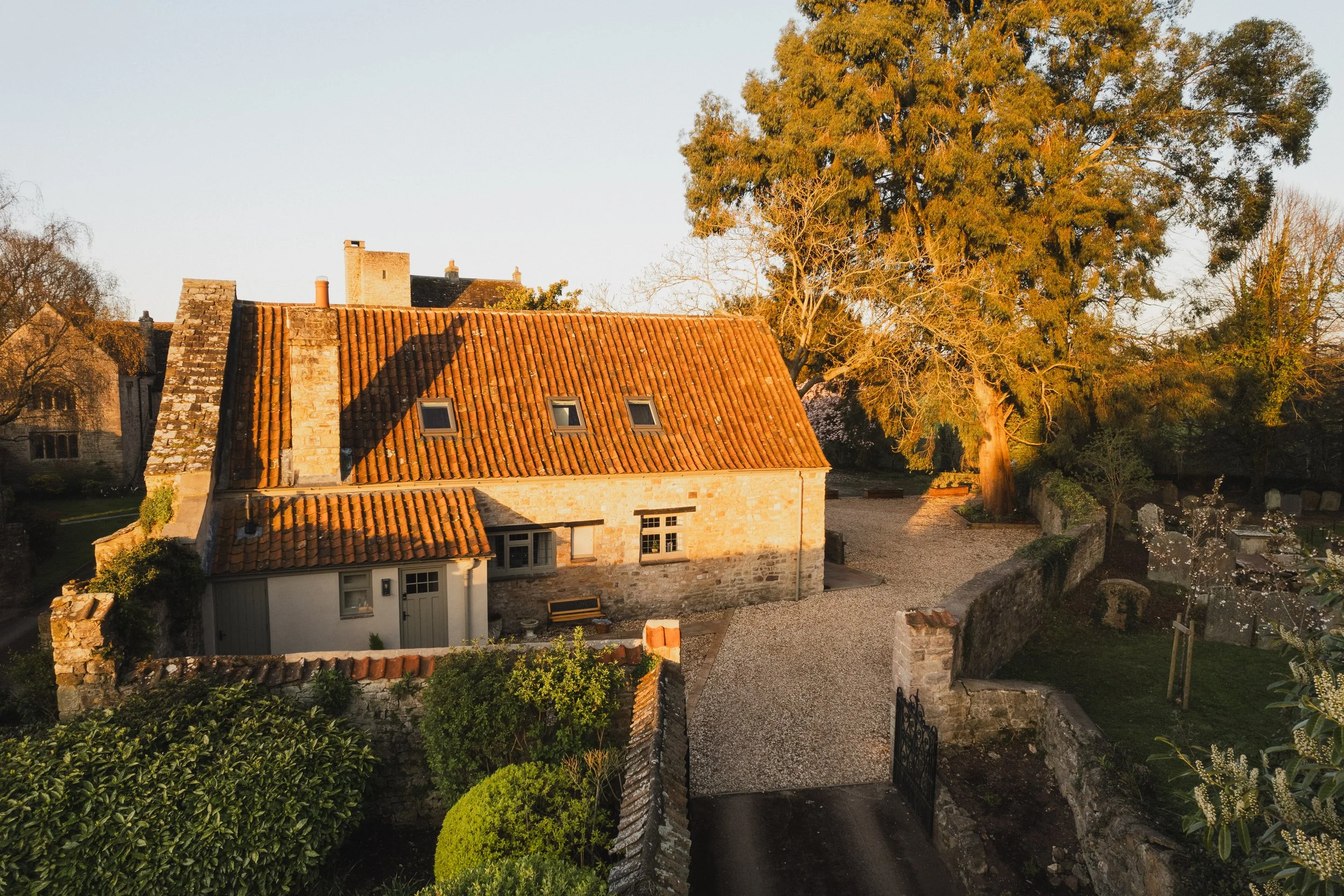 On the approach, you will drive through a set of wrought iron gates to find a large, private gravel driveway; yours for the duration of your stay. A cosy, gravel courtyard hugs the cottage and makes for a serene private area to sit and enjoy a morning coffee. The patio takes you to the hot tub area which has been privatised with fencing and offers stunning views of the church and age old Eucalyptus tree. The garden patio includes a table and chairs for 6 to enjoy al-fresco dining.